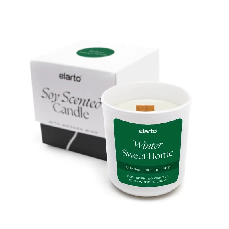 Zapachowa świeca sojowa elarto Winter Sweet Home to rodzinne wspomnienia pełne aromatów przypraw korzennych, dopełnionych nostalgicznymi nutami cynamonu, ze szczyptą złocistej, słodko-kwaśnej pomarańczy i słodkiego, soczystego jabłka. Do pomieszczenia wprowadza ciepły i świąteczny nastrój, tradycyjny zapach choinki i Świąt, idealny na zimowe dni. Świeca elarto Winter Sweet Home została wykonana z naturalnego wosku sojowego, ma drewniany knot. Podczas palenia radośnie tańczący płomień, wydaje bardzo przyjemny, kojący dźwięk skwierczącego drewna. Całość w szklanym słoiczku i ozdobnym pudełku. Łączny czas palenia świecy to około 36 godzin.