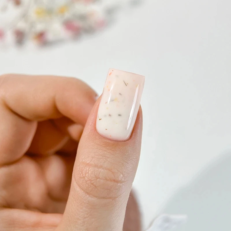 • Coverowy, kremowy odcień z zatopionymi, suszonymi kwiatkami (zapewnia krycie na poziomie 90-100%).